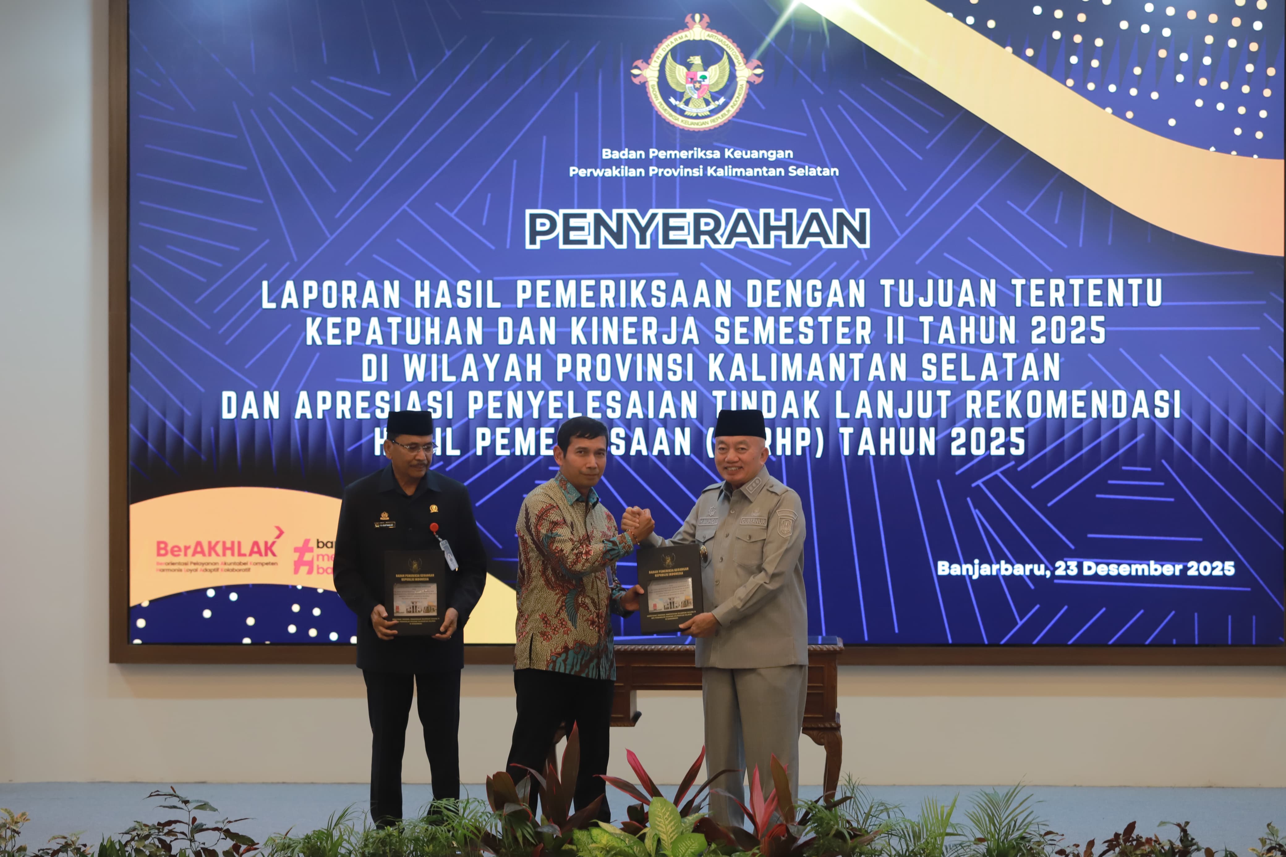 Banjarbaru - Gubernur Kalimantan Selatan H Muhidin menerima langsung Laporan Hasil Pemeriksaan (LHP) dengan Tujuan Tertentu Kepatuhan dan Kinerja Semester II tahun 2025 pada Selasa (23/12/2025) di Banjarbaru.
